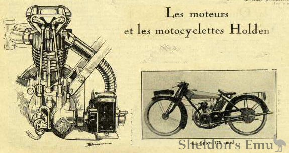 Fitted with CAV magneto, Binks carburettor and a Sturmey-Archer 3 speed gearbox, it was featured in an issue of Moto Revue which gave a Paris hotel as Holden's address. Geo Dupuy is mentioned in connection with this, but it is unclear whether the machine entered production under the Holden or another name, if at all.