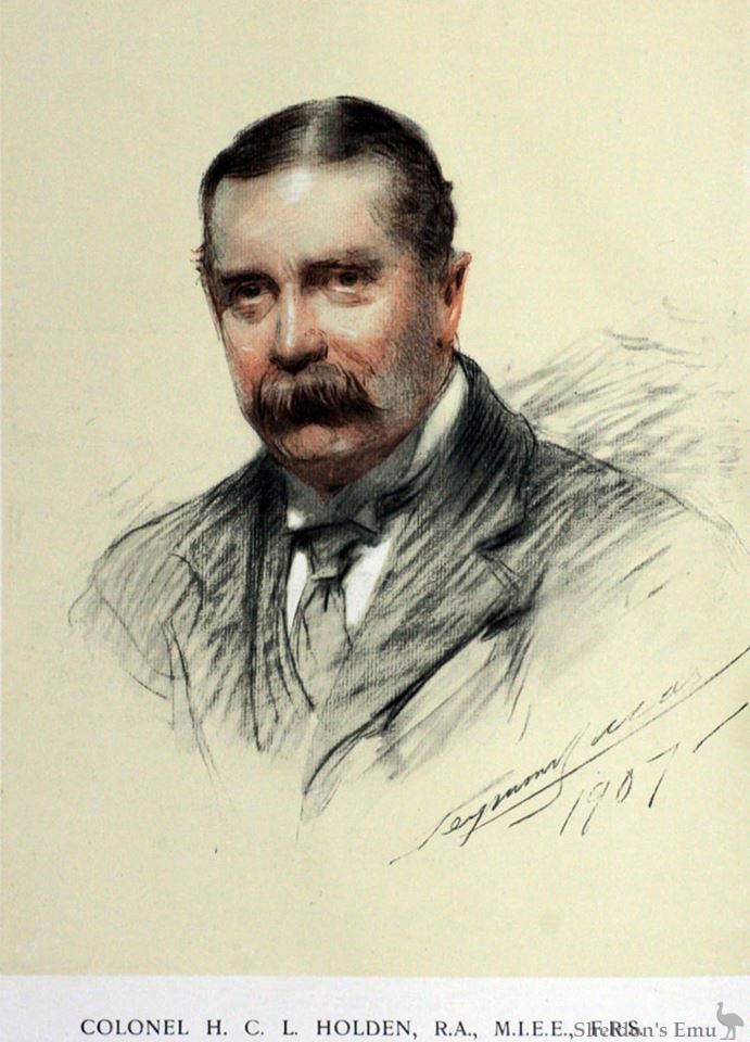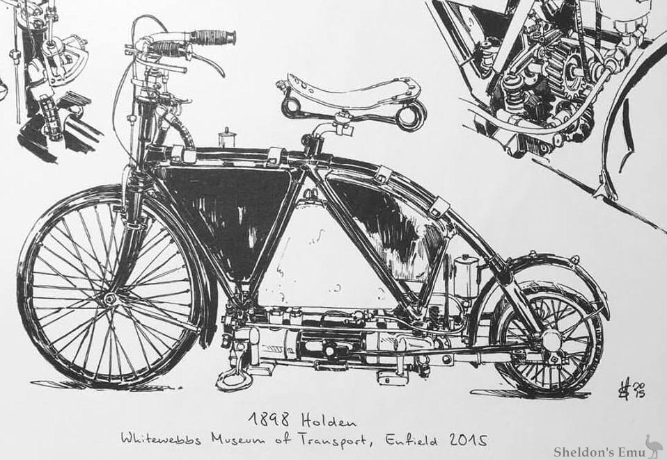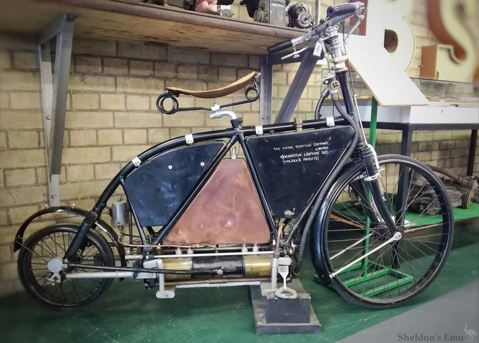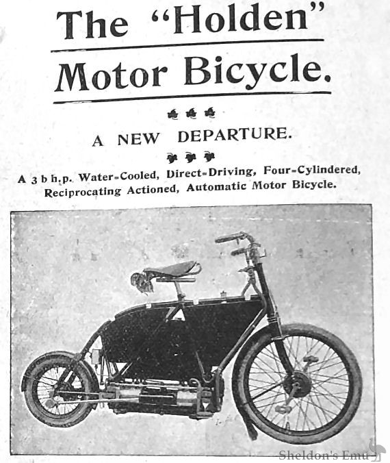 The Holden was manufactured by The Motor Traction Co., Ltd., 27 Walnut Tree Walk, Kennington between 1897 and 1902, from a design by Brig. Gen. Sir Henry Capel Holden. Patented in 1894, the Holden was the world's first four-cylinder motorcycle.