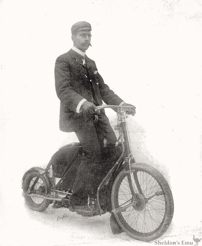 One notable point is the ease with which the motor starts - quite a revelation to those who have seen other motor users trying to do so. The rider walks beside the bicycle, and, pulling the "switch trigger" with his right hand, mounts from the foot-plate exactly as a bicycle rider mounts from the pedal. So certain is the starting that a rider can mount in the middle of a steep hill and ride up. There is no necessity to pedal to start the machine.