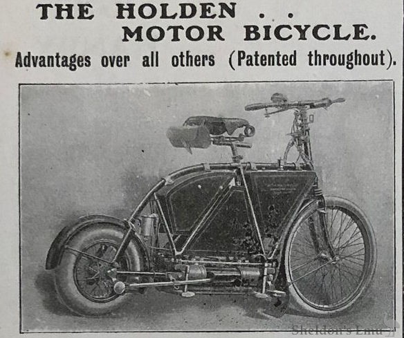 With water cooling and automatic lubrication the "Holden" motor bicycle can be run until the petrol tank is exhausted.