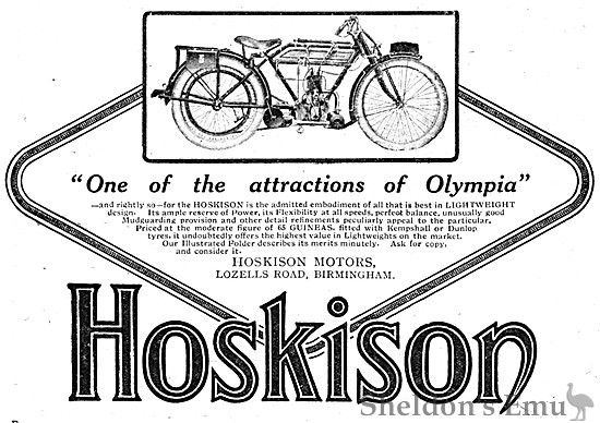 Initially named Hoskison Manufacturing Co of Digbeth, Birmingham, before changing to Hoskison Motors of Lozell's Road, Birmingham, the company produced motorcycles from 1919 to 1922.