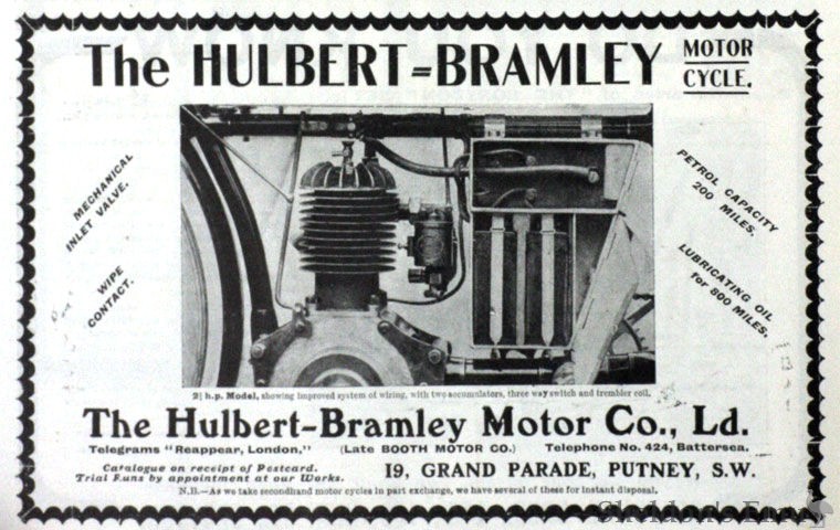 1911 Directory lists them as Hulbert Bramley Motor Co (S. W. Dowglass, proprietor), 96 Upper Richmond Road and 118a, Disraeli Road, Putney, London SW and as motor car manufacturers and motor manufacturers.