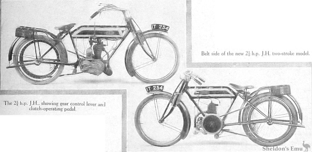 WE illustrate on next page two interesting lightweight machines called the J.H., which are being introduced by Mr. James Howarth (formerly manager of the Bradbury Company), at the J.H. Motor. Engineering Works, Oldham. The general details of the machines are very similar - both are fitted with B. and B. carburetters, Dunlop belts, Dunlop or Palmer tyres of 2in. section on 26in. wheels.