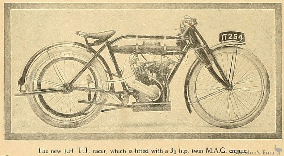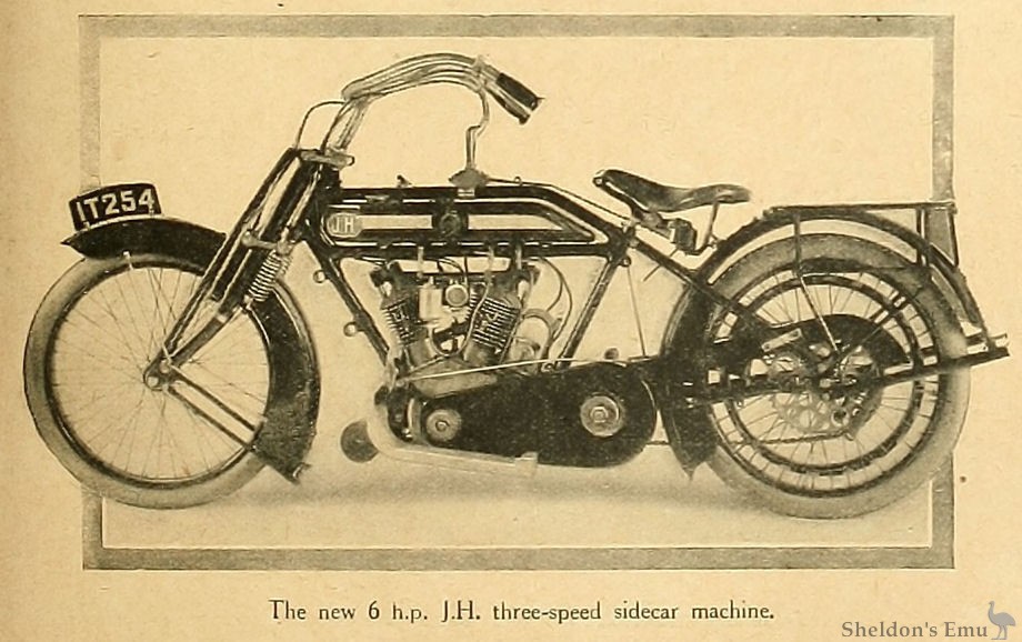 1915 JH offered the two Villiers-powered machines, plus models using 3½ hp and 6hp MAG V-twin engines, the latter with a three-speed or four-speed gearbox.