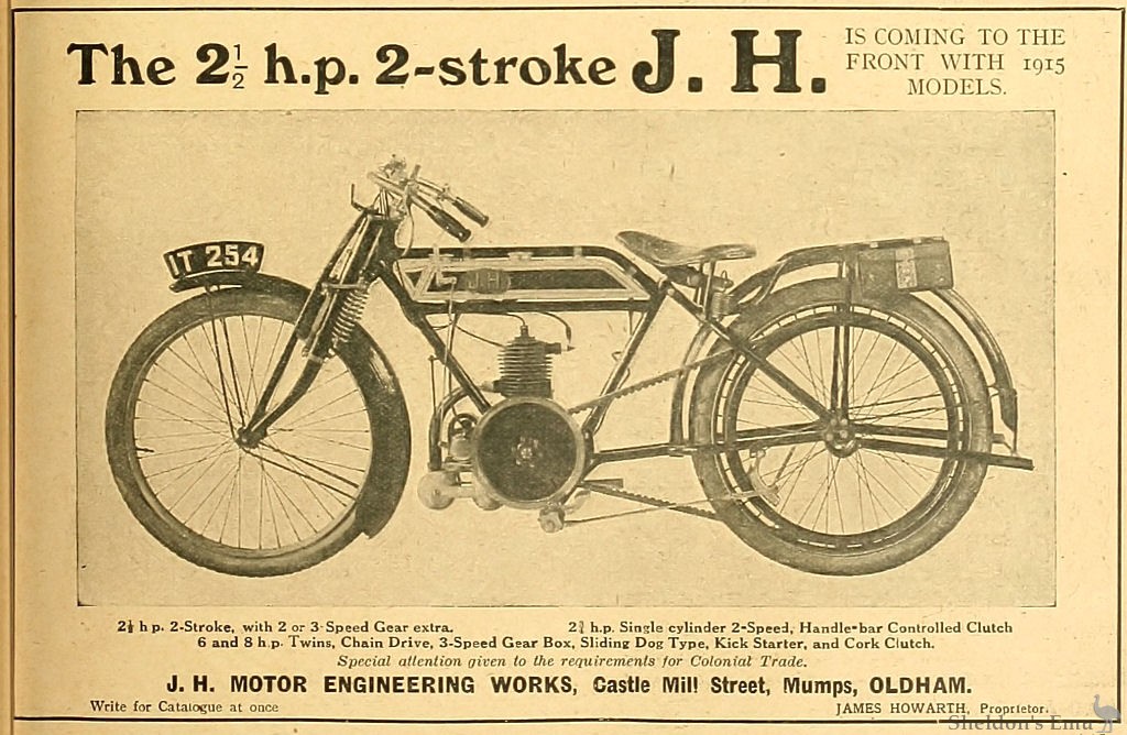 JH were the initials of James Howarth who produced motorcycles from 1914 to 1916 of the J. H. Motor Engineering Works in Castle Mill Street, Mumps, Oldham.