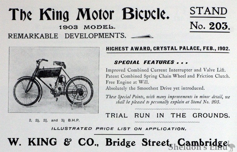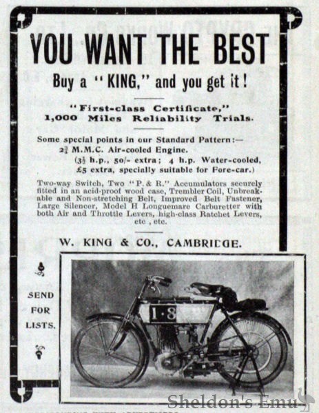 W. King and Co of Bridge Street Cambridge produced motorcycles from 1901 to 1905.