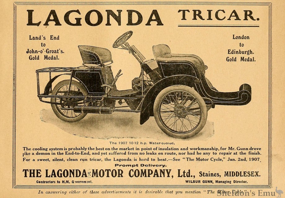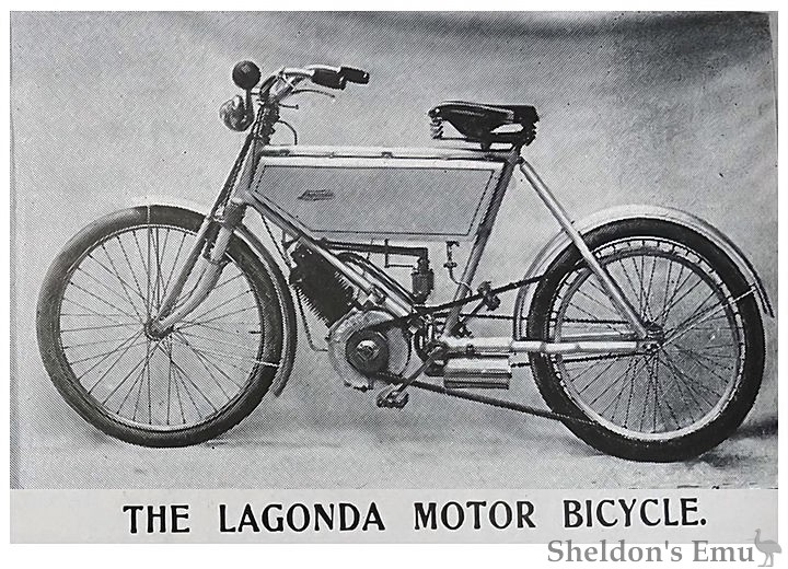 Lagonda motorcycles were produced in Staines, Middlesex, from 1902 to 1907, before the firm became famous as an automobile manufacturer.