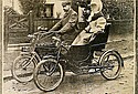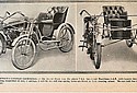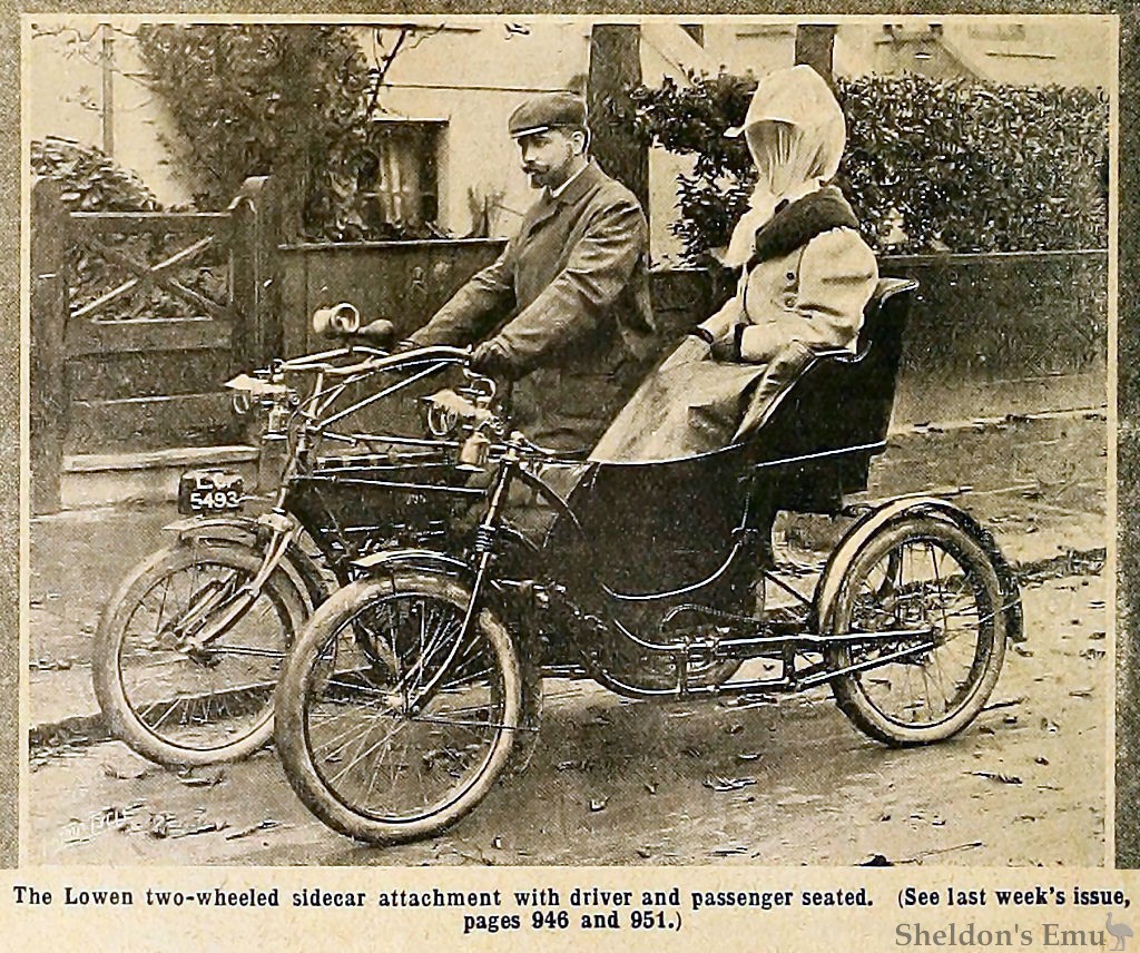 Lowen's patent sidecarriage - a novel two-wheeled attachment for converting motor bicycle into a four-wheeled passenger vehicle. Two examples are shown, one with a coachbuilt and one with a, wicker body. The illustration which we publish on page 951 clearly depicts the method of construction. The seats in both cases are supported on C springs, and much ingenuity has been displayed in making the attachment readily detachable. To the front and rear attachment tubes a breach lock joint has been fitted, so that it is possible to remove the sidecar within five minutes.