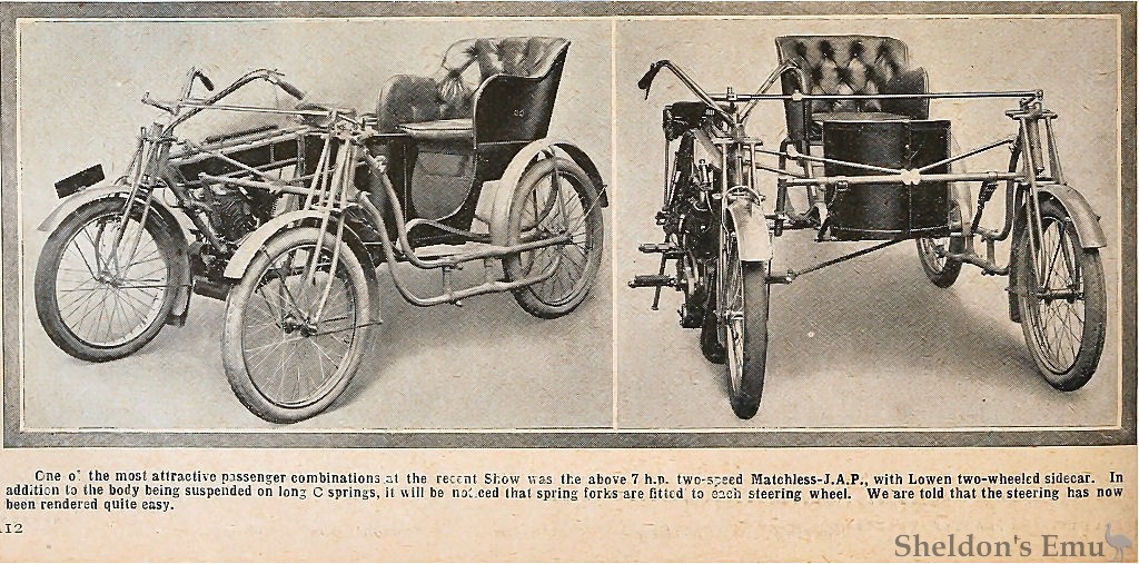 One of the most attractive passenger combinations at the recent Show was the above 7 h.p. two-speed Matchless-J.A.P., with Lowen two-wheeled sidecar. In addition to the body being suspended on long C springs, it will be noted that spring forks are fitted to each steering wheel. We are told that the steering has now been rendered quite easy.