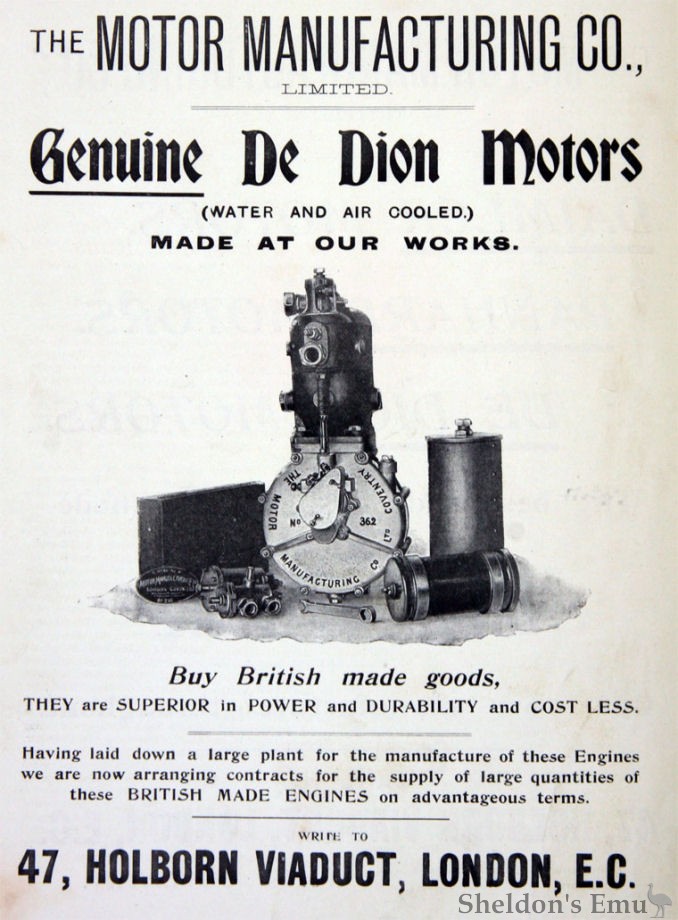 Production began in 1898 with MMC tricycles and copies of the De Dion engine. These were used by the British Army in the Boer War. They also advertised the Motocyclette, with the engine over the front wheel, which it drove by belt.