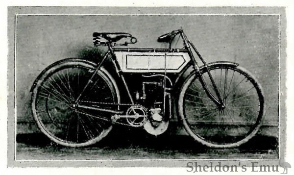 4 h.p. King Dick; 85x88 mm. (499 c.c); single-cylinder four-stroke; side-by-side valves; hand pump lubrication; B. and B. carburetter-; chain-driven magneto; three-speed Sturmey-Archer gear; chain and belt drive; Dunlop 25 x 2½ in. tyres.
