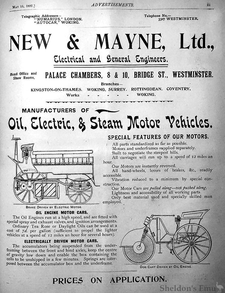 1891 Anthony George New and Arthur James Mayne formed a partnership as electrical and general engineers, Westminster, with works at Woking