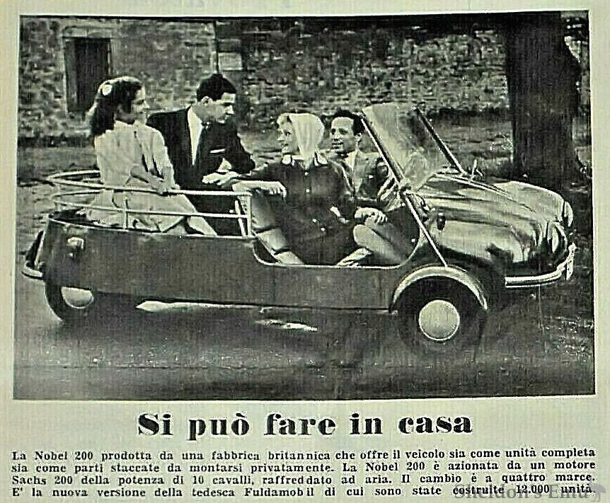 La Nobel 200 prodotta da una fabbrica britannica che offre il veicolo sia come unità completa sia come parti staccate da montarsi privatamente. La Nobel 200 è azionata da un motore Sachs 200 della potenza di 10 cavalli, raffreddato ad aria. Il cambio è a quattro marce. E' la nuova versione della tedesca Fuldamobil di cui sono state costruite 12.000 unita.