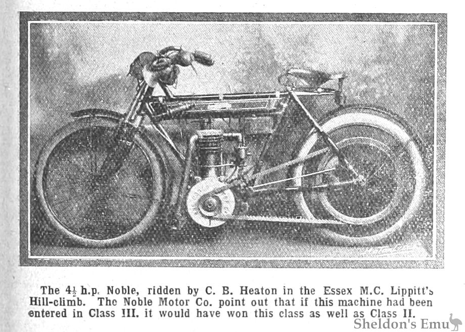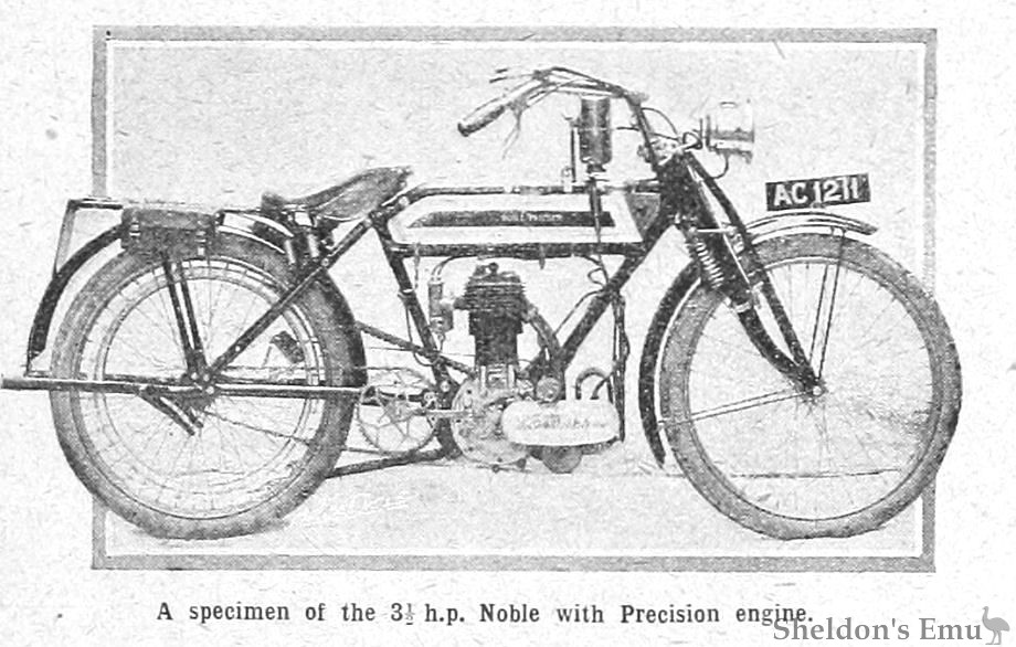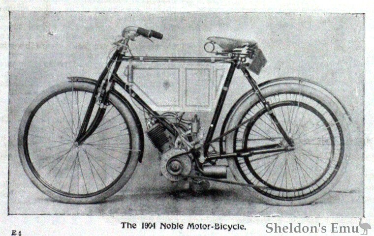 The Noble Motor Bicycle. Perhaps the lowest priced motor-bicycle yet introduced is the £29 machine manufactured by the Noble Motor Company, of Pocock Street, Blackfriars, S.E. The engine of 2.5 h.p., is of original design, and has already been illustrated in "THE MOTOR." Petrol capacity is 1.75 gallons, and room is provided in the tank for two accumulators. L'Eclair trembler coil is fitted, and wipe contact. The carburetter is a D. and R. fitted with throttle which is regulated by a lever easily reached by the rider. The lubricating pump can also be easily operated while driving. An efficient silencer of special design is supplied, and any pattern tyres to order. A V belt is used, and the control is by exhaust lift from handlebar by Bowden lever and wire, the electrical ignition being operated by Mason and Brown switch on handlebar. The machine is well finished in black enamel or aluminium finish can be had for an extra 10s. The exhibit will be at the Stanley.