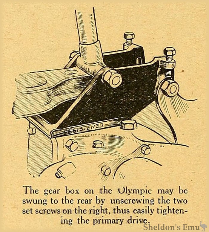 The gear box on the Olympic may be swung to the rear by unscrewing the two set screws on the right, thus easily tightening the primary drive.
