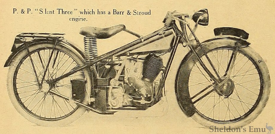 1922. The Silent Three model appeared, fitted with the sleeve-valve Barr and Stroud engine and enclosure panels. The frames sloped in a straight line from the headstock to the rear wheel, which had an unusual spindle.