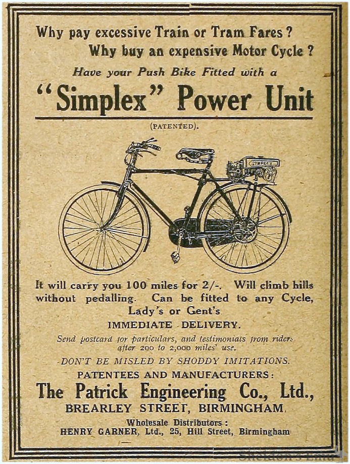 Hubert Henry Patrick built the prototype in 1915, but war intervened and it did not enter production until October 1919. It had a strengthened bicycle fitted with a 105cc two-stroke engine. The unit was sold separately, to be fitted to any gents' or ladies' bicycle. It fitted above the rear wheel which it drove by chain.