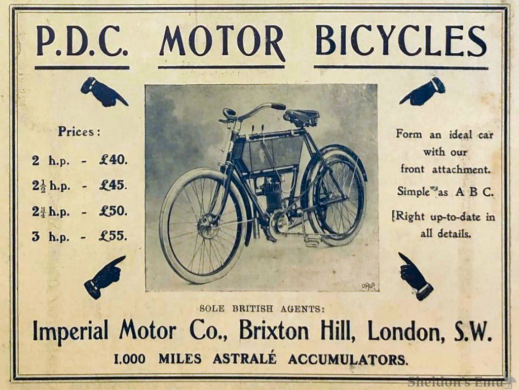 PDC motorcycles were sold by the Imperial Motor Co of Brixton Hill, London, from 1903 to 1905.