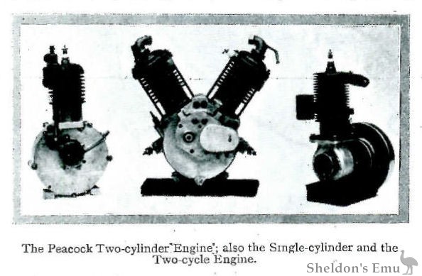 A great variety of accessories of all descriptions, and particularly those in connection with ignition systems., are exhibited by Messrs. Charles Peacock and Co. on Stand 95a. The principal items of interest are in the engines shown on this stand. One is of the two-cylinder variety, with cylinders inclined one to another at an angle of about fifty degrees. The cylinders have a bore of 68 mm. and a stroke of 72 mm., and, running at a speed of 1,200, develop 4½ h.p. A belt pulley fitted is for a flat belt. The crank chamber is fitted with double clip bosses. A two-cycle engine suitable for a bicycle is also seen on this stand. Running at 1,800 revolutions per minute, it develops 2¼ h.p. There are no valves whatsoever, excepting the piston, which in itself acts both as the inlet and the exhaust valve. The total weight of the engine is 18 lbs. (Stand 95a.)