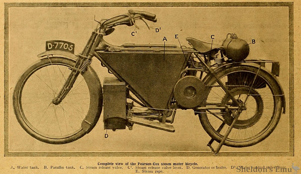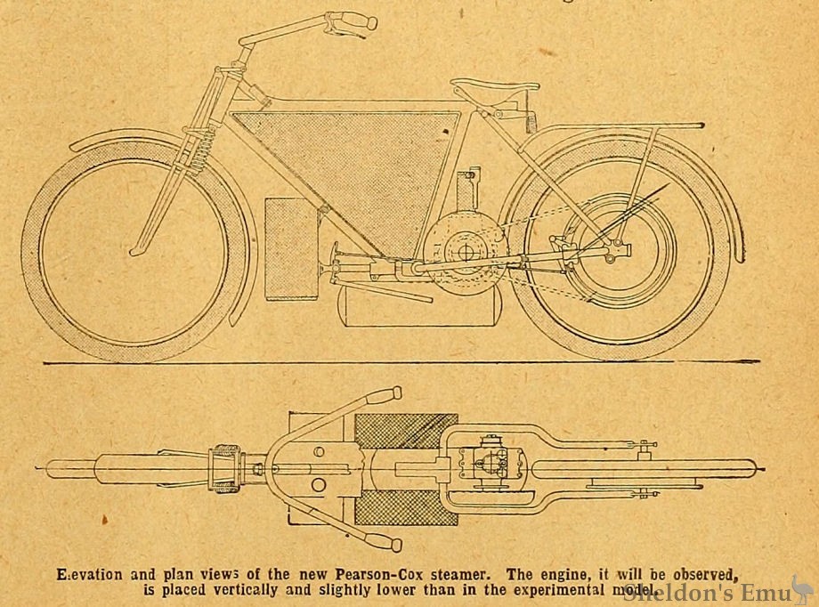 It is now our pleasure to make the announcement that Messrs. Pearson and Cox, Ltd., Shortlands, Kent, who are manufacturers of light steam cars, have been giving considerable attention to the question of propelling a motor bicycle by a steam engine. They have been experimenting for about two years, and have evolved the machine which is the subject of this article.