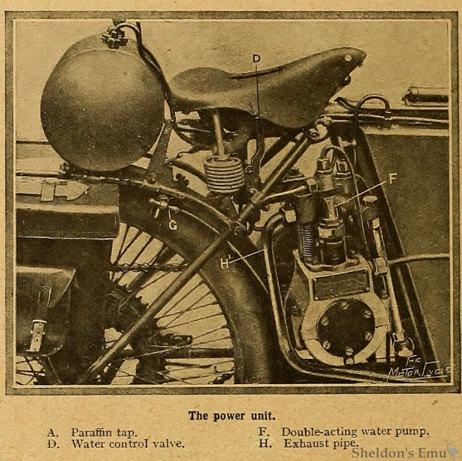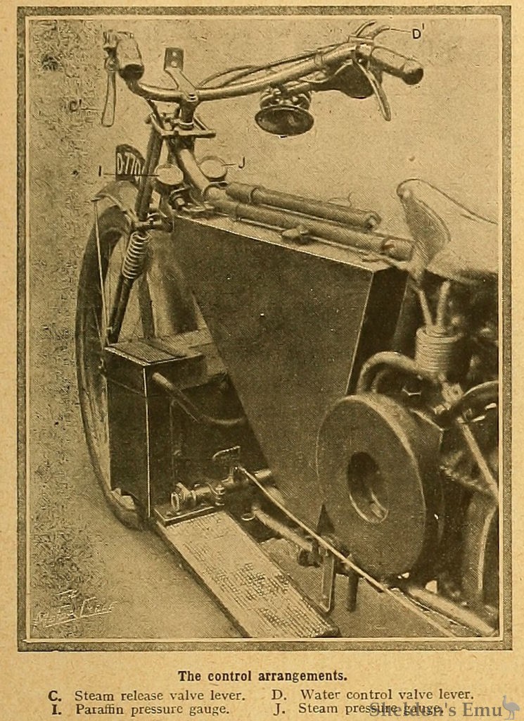 The engine is set in the old Ormonde position behind the saddle tube, and the diamond frame is taken up by the water tank, while fitted transversely across the forward ends above the footboards is the generator or boiler. The engine has a single acting cylinder, and develops 3 h.p., with a bore of 1¾ in. and stroke of 2in.