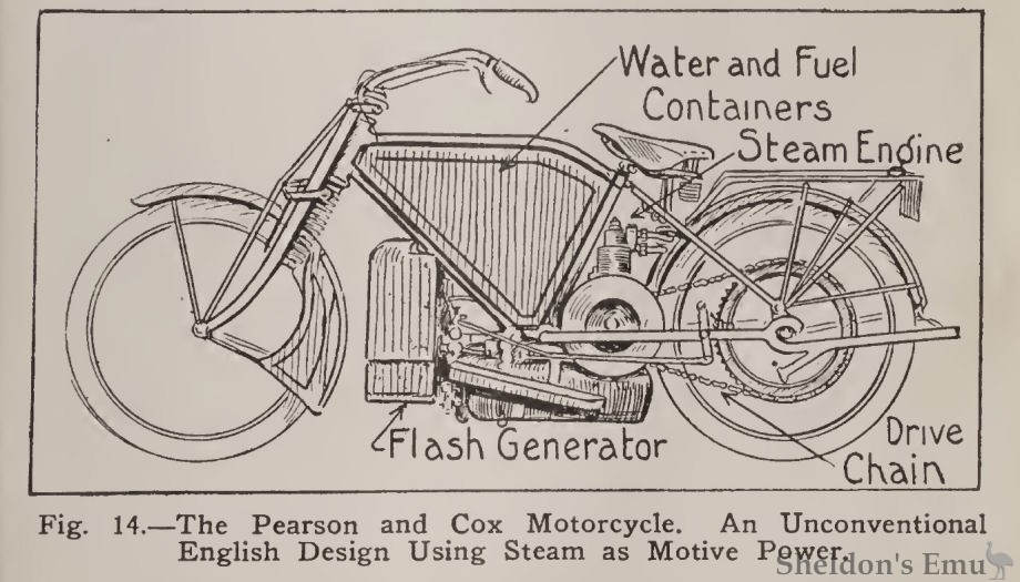 The drawing at Fig. 14 shows the general appearance of this machine which is known as the "Pearson and Cox," presumably because it is made by this firm in Shortlands. Despite the unconventional means of propulsion, this motorcycle is not so much different than those we are accustomed to that it would attract attention except of those well versed in motorcycle construction.