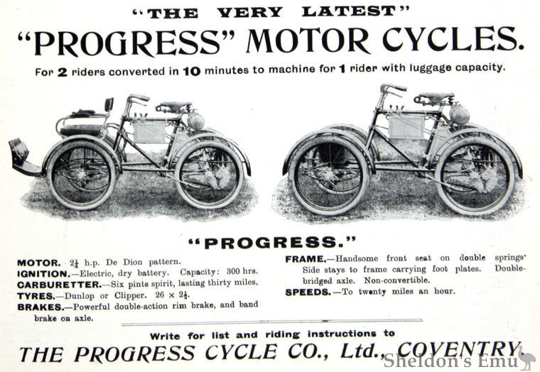 Progress motorcycles were produced from 1900 to 1905, by the Progress Cycle Co, of Foleshill, Coventry.