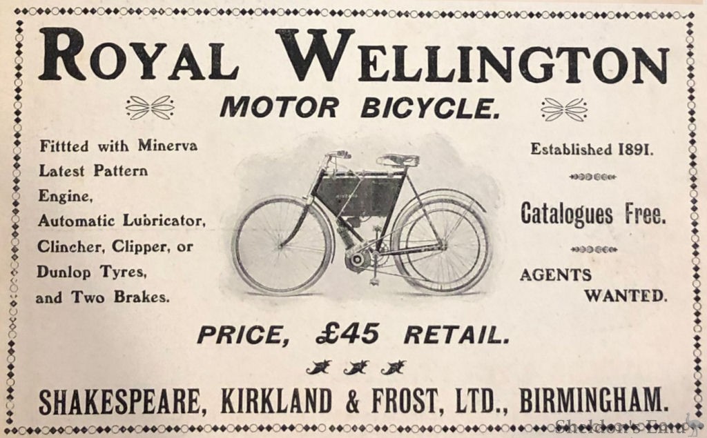 Royal Wellington motorcycles were produced by Shakespeare, Kirkland & Frost, Ltd., of Birmingham c.1901 to 1902.