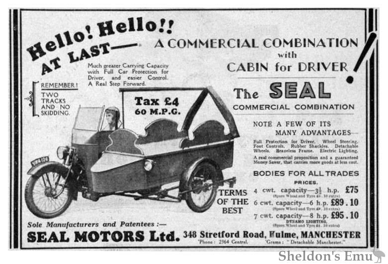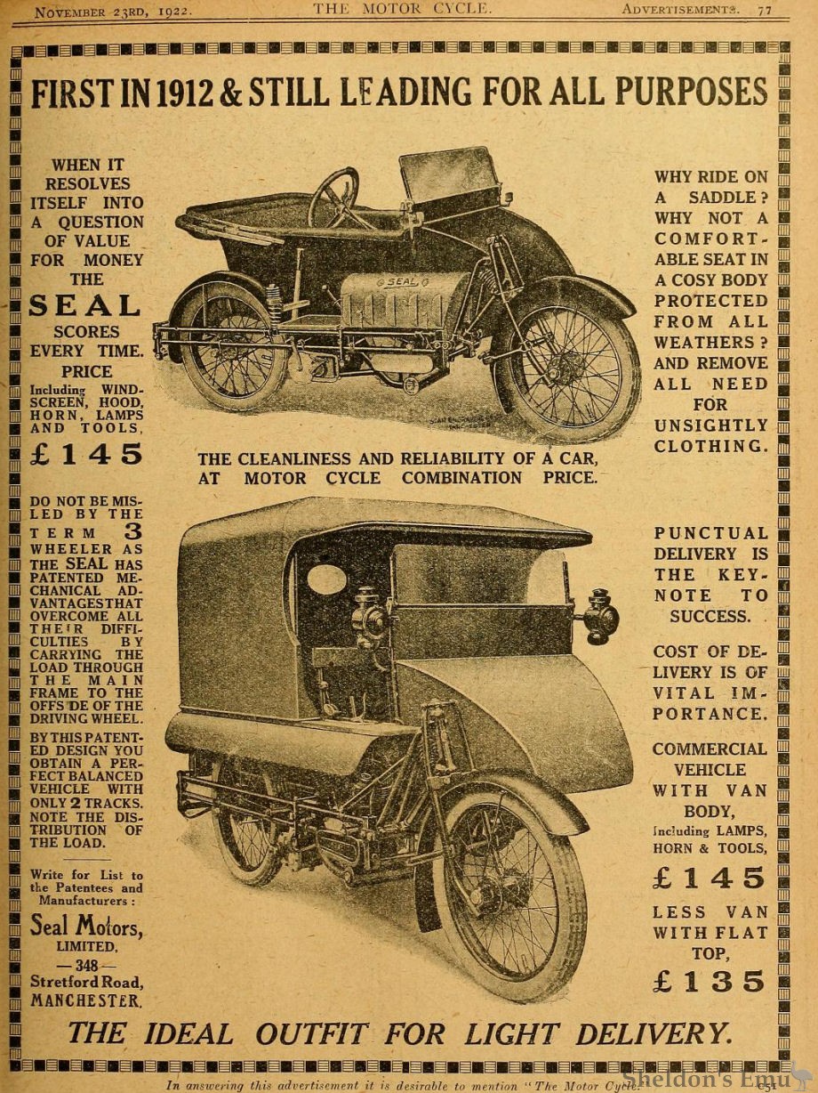 En una época en que el sidecar era la única alternativa económica al automóvil y para ofrecer un nivel de protección similar a éstos, el Seal proponía un conjunto donde el conductor estaba instalado en el sidecar, junto con el pasajero. Así entre 1912 y 1924 fue ofrecida esta inusual máquina clasificada como un “Sociable” de tres ruedas. Esta era una forma especial de motocicleta con un sidecar que había sido ampliado para llevar al conductor y los pasajeros, mientras que los componentes mecánicos estaban fuera de él. Era accionado por un motor JAP V-twin con una caja de cambios de tres velocidades montados en un cuadro construido a partir de tubos rectos sujetos con abrazaderas (sin empipar) y con la horquilla delantera conectada a un volante en el sidecar.