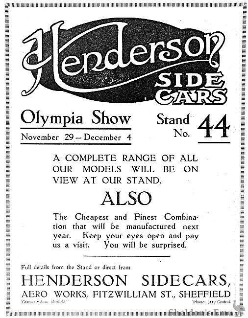 Henderson Sidecars, Aero Works, Fitzwilliam Street, Sheffield. One of the most interesting machines in the Show is the new 4 h.p. Sheffield Henderson and sidecar. It has many unusual features. The metallurgical portion of the design has been considered with more than usual care, and its makers are one of the few firms who know in actual fact what the nature of the material is of which their machines are built. Apart from this the price of £150 is a tempting enough bargain for a good motor cycle and sidecar.