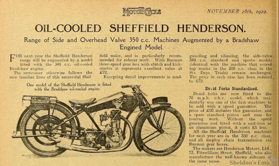 1922 That new model was catalogued and sold with a guarantee of 70mph (112km/h). There was also a sporting sidecar outfit with a tuned 545cc sv Blackburne engine and streamlined sidecar. In June, the factory even claimed several world records in the 250cc class. Sheffied Henderson must have been one of the very few makes that placed the toolbox under the top tube behind the steering head, a position that obviated a rather unusual tank shape, an early form of saddle tank.