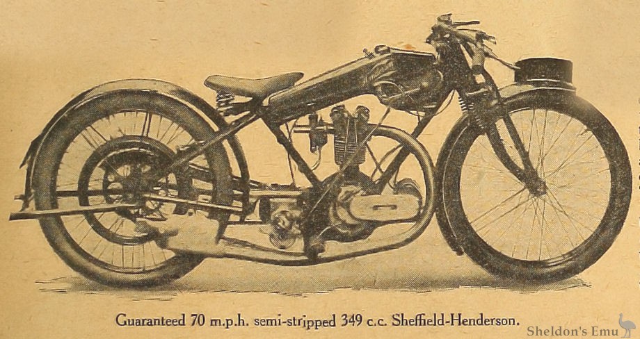 In addition to a range of Henderson sidecars for which this Sheffield firm is now well known, two new models of the Sheffield-Henderson motor cycle will be exhibited; one of these will be fitted with the 2¾ h.p. o.h.v. Blackburne engine, and having a frame of rather unique design, which gives an exceptionally low riding position.