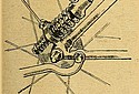 As regards the frame of the machine, the construction of the forks and head is interesting, because very large steel balls are used for all the bearings, while the recoil of the front wheel is taken on C shaped leaf springs, which are bolted very rigidly to the forks. At the rear the saddle is fixed upon a cantilever bracket which can be adjusted to give increased or decreased leverage, the load being taken through springs to the frame, so that the rider's weight is entirely sprung. The remainder of the machine is normal, chain drive from the crankshaft to a Sturmey-Archer gear box, thence to the rear wheel through another chain; both brakes act on a rear wheel dummy belt rim.