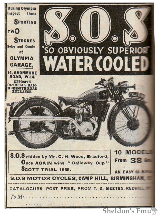 In 1934 the range expanded to include both air-cooled and water-cooled machines of 172cc to 346cc, some with weather protection in the form of leg-shields and deeply valanced mudguards. At this point some models were named, for example the Magnetic and the Thunderbolt. By 1936 Meetens Motorcycle Mecca had opened, acting as main retail outlet for the well-finished S.O.S. motorcycles.