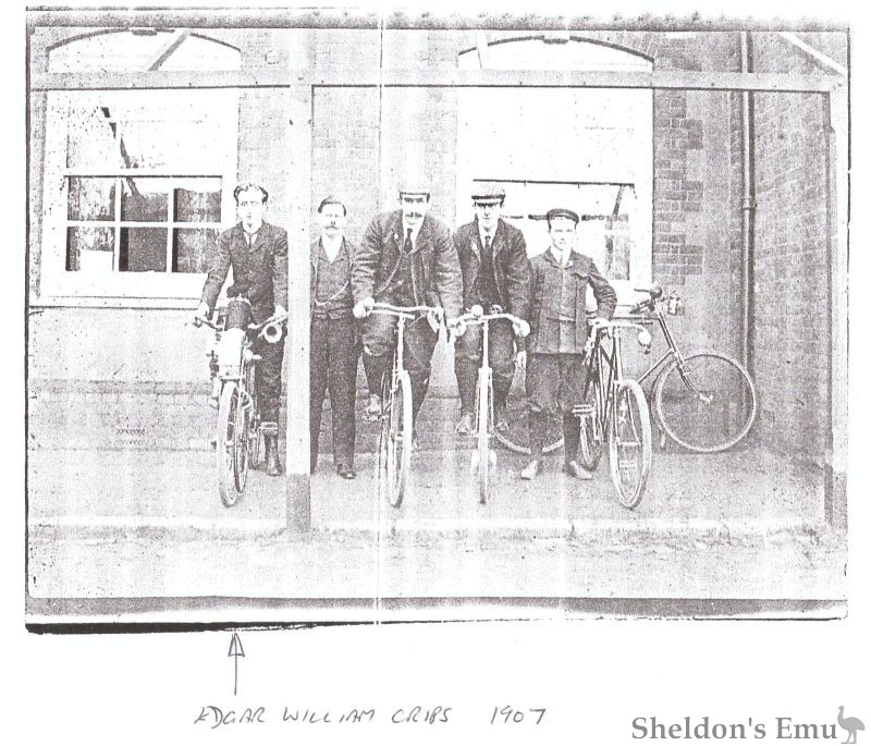 Edgar William Crips He seems to have been the true entrepreneur of the family, effectively taking over his brother’s business and running it single handed from the age of 16. The 1907 photo, believed to have been taken at another location shows Edgar on the left of a group presumably exhibiting the range of their products. Edgar is riding what is clearly a motor bike, and this is presumably the first of the motorised "SPIRCs Bikes". The engine is mounted above the front wheel, which is belt driven. Presumably it was a 2-stroke and one wonders how stable was the steering and where the petrol tank was!!