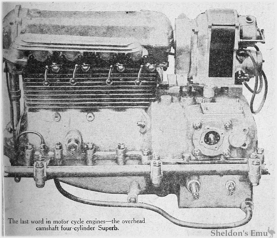 Since the passing of the T.M.C., it is a deplorable fact that Great Britain has not, for many years, possessed a home-built four-cylinder motor cycle. Therefore, if for this reason alone, the advent of the Superb Four is calculated to arouse great interest. But, apart from this, the high efficiency design is unique when applied to a motor cycle, and actually advanced when compared with average car practice.