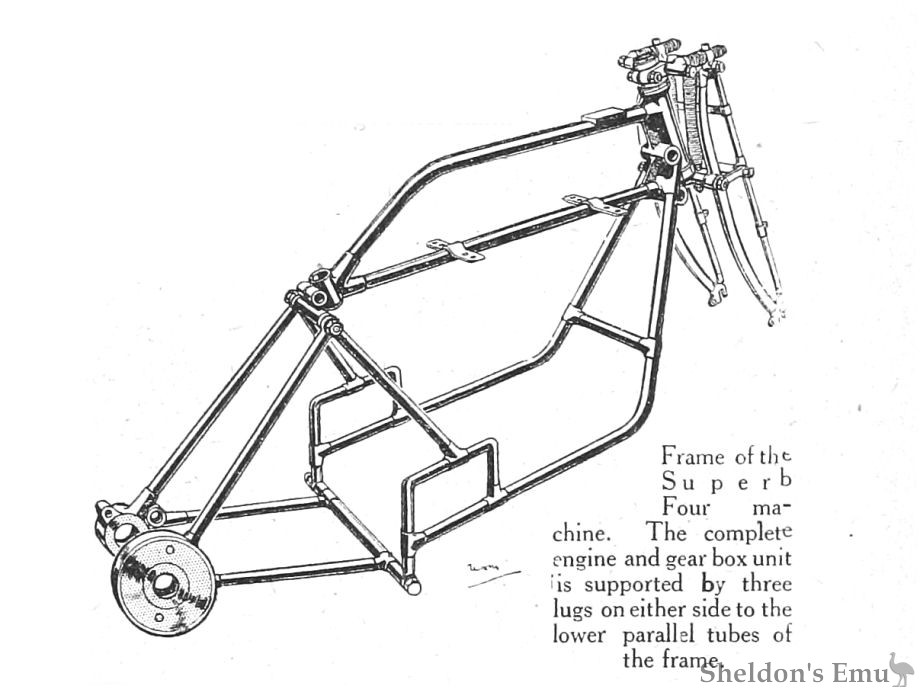 Frame of the Superb Four machine. The complete engine and gear box unit is supported by three lugs on either side to the lower parallel tubes of the frame.