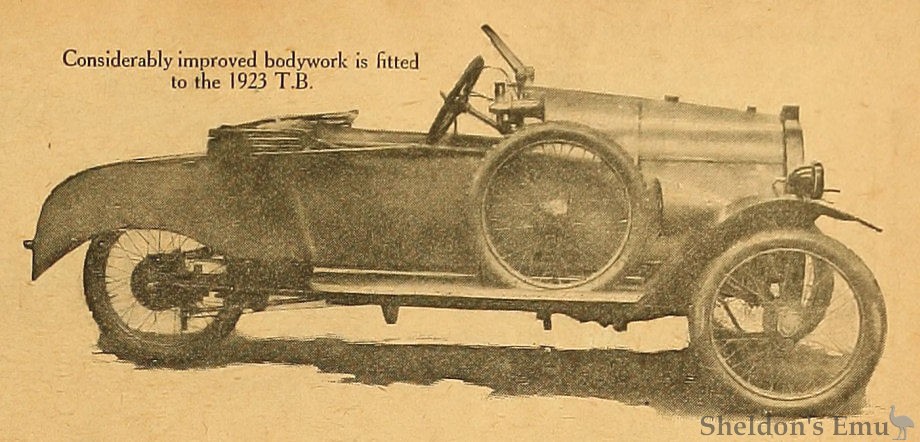 The essential feature of any three-wheeler is its chassis design, this point having more bearing on the success of the vehicle than any other. In the T.B. chassis every possible weakness has been closely studied, and the result is a sound and satisfactory design. Rear springing is by semi-elliptical springs mounted on the cantilever principle, the front being of the quarter-elliptic type. All three wheels are interchangeable, the spare wheel being carried on the off side of the body. A big improvement, too, has been effected by the introduction of a ratchet brake acting on an external contracting band instead of the internal expanding type. In general appearance the T.B. is good, and there is a cleanness and finish about all the models which, adds distinction to a pleasing range. At £155 the standard air-cooled T.B. is an attractive proposition, while for an additional £10 a water-cooled engine can be fitted, as well as several refinements in detail. T.B. three-wheelers have done remarkably well in competitions, and those who favour a sports model can obtain one with the guarantee of 50 m.p.h. Its price is £175. Family men are also catered for with a model having a type of body known in the car world as the "clover leaf"; on the T.B. this arrangement gives accommodation for a child between and slightly behind the two normal occupants.