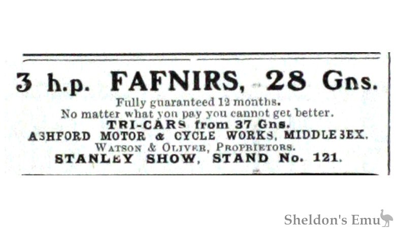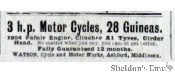 Watson Cycle and Motor Works of Ashford, Middlesex produced a 3hp Fafnir-powered machine in 1904.