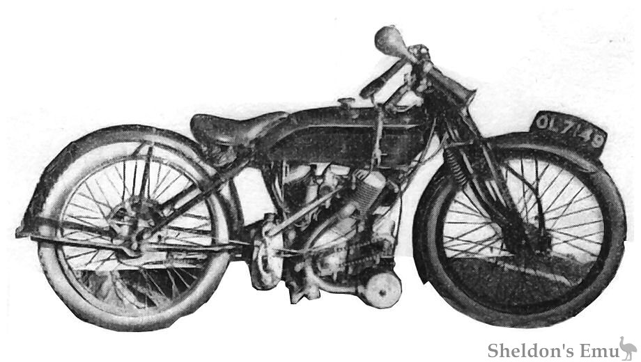 Exhaust pipes exited at the sides of the cylinders, front right and rear left, and fed into a large cylindrical aluminium expansion chamber at the front of the engine. Ignition was by chain-driven Bosch magneto mounted above the exhaust chamber. A single B&B carburettor supplied fuel. Drive was delivered to the rear wheel by chain via a three-speed gearbox.
