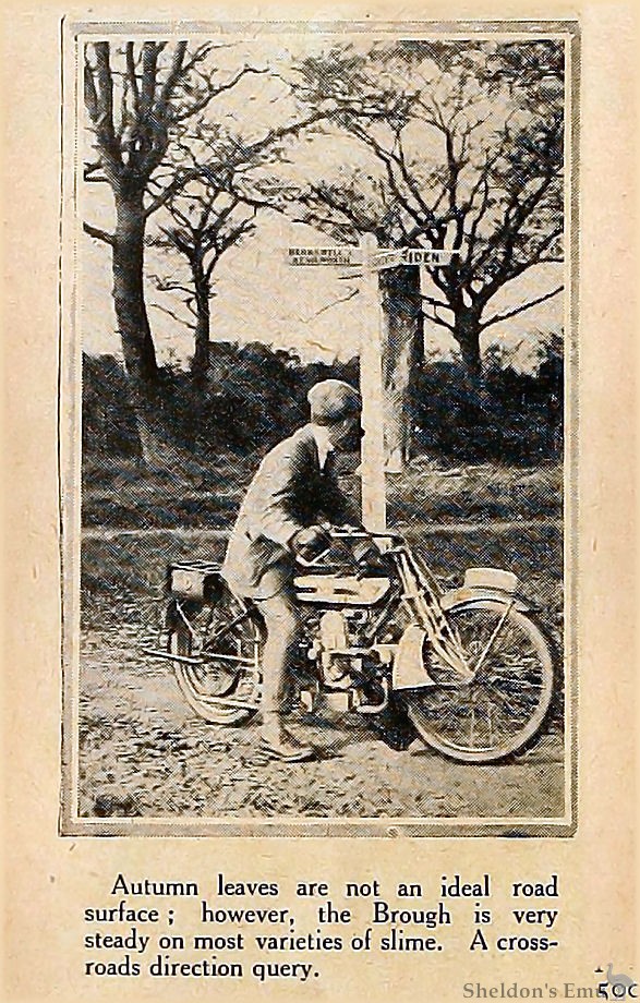 Once under way the speed, on account of the remarkable degree of comfort, becomes deceptive, and only with streaming eyes and a "scraped" corner comes the realisation that we have been doing forty-five on a road where we had previously never exceeded thirty-five. It must not be inferred from this bit of lurid corner work that the steering is difficult. Naturally, an outsize in wheelbases makes the Brough a different proposition from the usual T.T. machine to pilot round a "hair-pin"; but, again, experienca docet, and, having learned - well, the cycle almost steers itself.