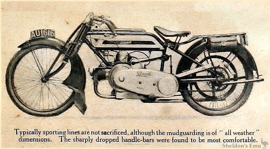 Mudguarding for a sporting type of mount is unusually complete, a large flap at the lower end of the front guard proving most effective without, on account of its diagonal setting and flexible construction, materially affecting wind resistance.