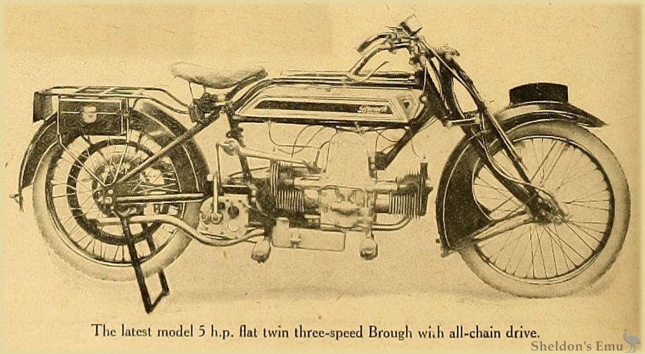 For nearly ten years Messrs. W. E. Brough have produced flat twins with a distinctly sporting flavour; and the machine that we recently rode away from Nottingham bears evidence of this in every line. Although not identical in every respect with their 1921 model, the main features are the same. It is an entirely new design, and has a 496 c.c. flat twin engine with overhead valves and detachable cylinder heads. A speed I of 60 m.p.h. is guaranteed, which, for a three-speed countershaft machine with touring equipment, is an excellent figure.