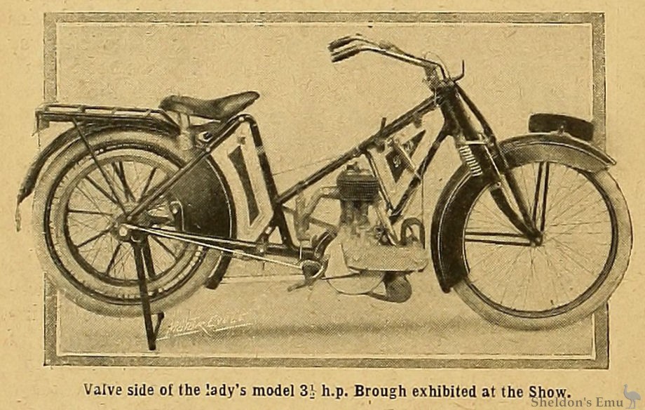 1912 A larger, 6hp V-twin model was available for touring and racing. The 3½ hp single was enlarged and a two-speed counter-shaft gearbox added. There was also an 8hp V-twin engine for the Brough Monocar and there was also a ladies' version, with an open frame and a 3½ hp engine.