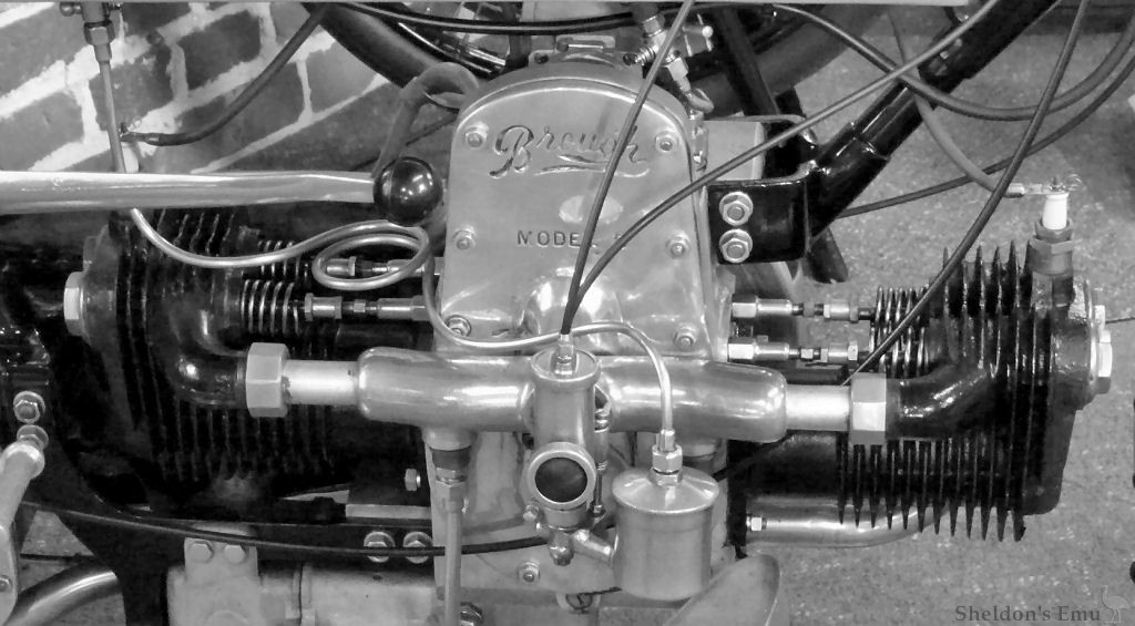 1913 George Brough was entered in the Senior TT, on a model with a flat twin engine, but for the race an ABC twin engine was used as their own was not ready. Unfortunately George was forced to retire early from the race. Later in the year, the firm announced their own 3½ hp 497cc flat-twin model with ohv, the U. H. magneto clamped to the crankcase top and the two-speed gearbox to the crankcase underside. Chain drive was used from engine to gearbox while the final drive was from an adjustable pulley by belt. It was also fitted with Druid forks.