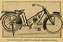 Another machine of this type is the 3½ h.p. Brough, which is absolutely bristling with good points. The frame is strengthened by means of duplex down tubes, which are exceedingly neat and graceful as well as strong. Of special note are the extra air-cooling arrangement, the easily detached front wheel, and the efficient guarding which all point to the practical mind of the designer. It is fitted with the Armstrong three-speed gear and handle starting, and would be an ideal sidecar machine for a lady.