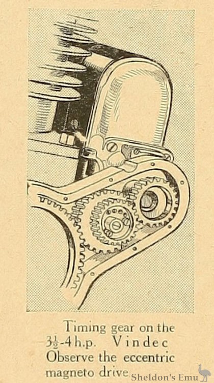 IN our issue of October 15th (page 437) we dealt with the Vindec two-stroke and the interesting and beautifully made little engine fitted to the 3½-4 h.p. twin-cylinder Vindec, sold by Messrs. Brown Bros., Ltd., Great Eastern Street, E.C. We have now been enabled to see one of these machines in its final form, and it must be admitted that it is an exceedingly handsome little mount. The gear supplied is the Armstrong three-speed, which in future models will be supplanted by the Sturmey-Archer.