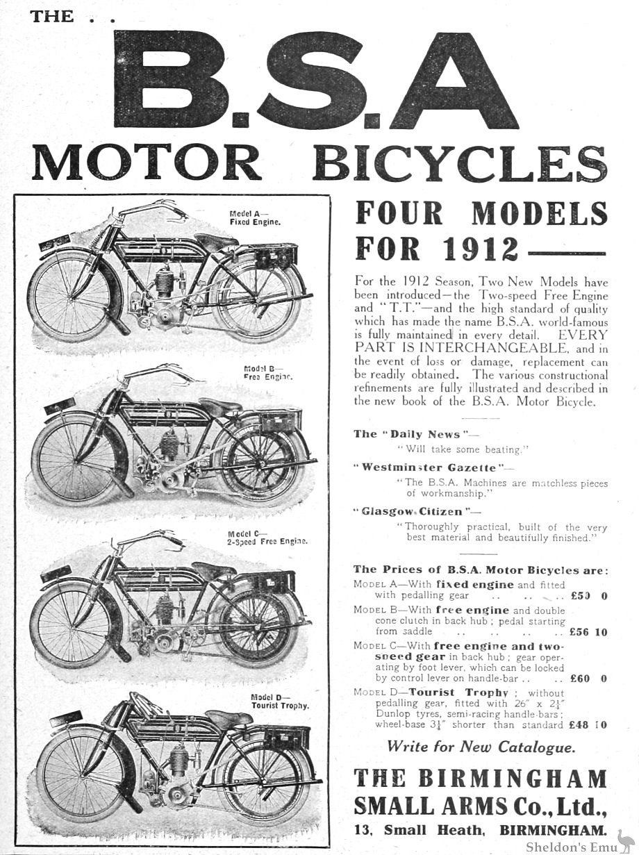 BSA announced 1912 models A, B, C and D in late 1911 as having interchangeable parts.