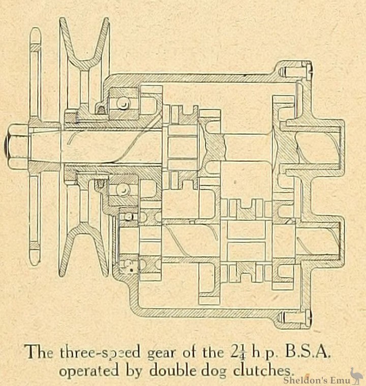 A chain drive connects the engine to. a three-speed gear box designed much on the lines of the standard and well-known B.S.A. gear. It is, of course, smaller, and has neither clutch nor kick-starter. A large diameter belt pulley is fitted, and the final drive is by means of a 7/8in. belt. The ratios supplied as standard are 5.7 to 1 on top, 8.5 to 1 middle, and 15.9 to 1 low. The driving chain is carefully enclosed.