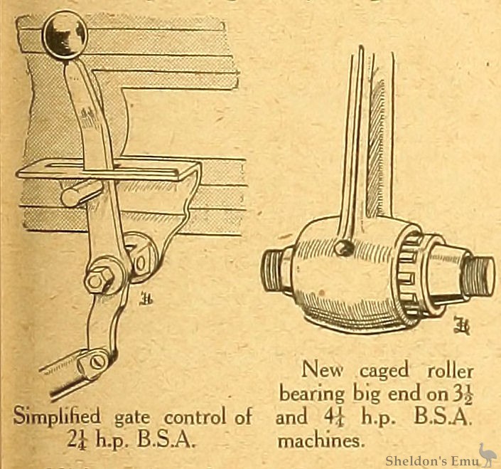 The 3½ h.p. engine is now only fitted to the T.T. model; the engine has undergone practically no changes, with the exception of the fitting of a roller bearing big end. This bearing is unusual, in that the rollers are mounted in a cage, and consequently are not allowed to touch each other, but bear only on the crank pin and the inner end of the hardened connecting rod. An interesting alteration has been carried out in the frame, for the head lug is curved slightly upwards. This construction, when properly carried out, is extremely strong and yet light. The addition of a long tail pipe for the exhaust completes the innovations in this type, which is, of course, still fitted with a B.S.A. carburetter and spring forks.